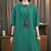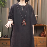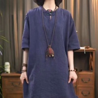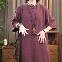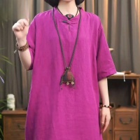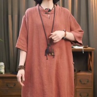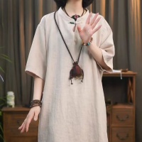 夏日文藝風中長款寬鬆七分袖上衣 亞麻透氣 立領復古 舒適自在 盡顯優雅