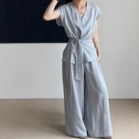 韓系高級感V領綁帶套裝 系帶設計顯瘦 搭配垂感闊腿褲 慵懶又高級 輕鬆打造時尚氛圍感